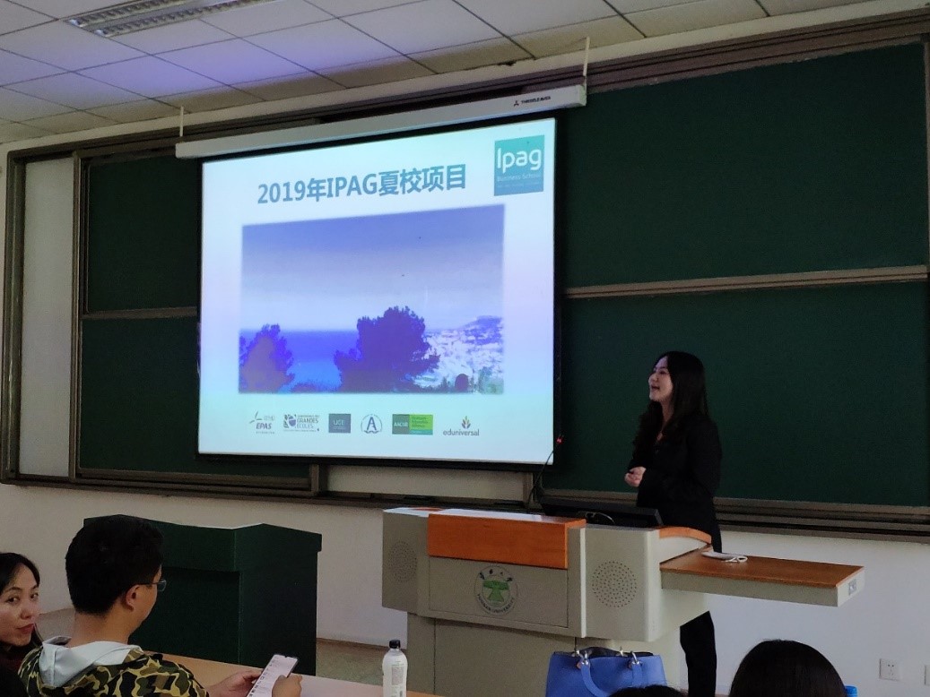 随后,来自法国IPAG商学院的倪老师对公司IPAG志愿者同学所进行的各项活动表示了感谢,并对法国与IPAG商学院的整体情况做了介绍。倪老师图文并茂地为同学们描绘了在法国生活学习的图景,详细地说明了IPAG夏校特色课程和日程安排,最后对同学们关心的生活学习费用等问题做了细致地解释。