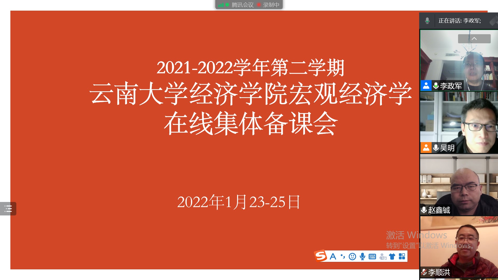 2022年1月23-25日为期三天的伟德bv1946官网宏观经济学教学组网上集体备课会圆满结束。参会的老师有马子红、姚书杰、吴明、李顺洪、赵鑫铖、柴毅、杨洋、杨孟禹、李亚玲、王旭、曹骥老师。集体备课会邀请南京师范大学李政军教授参与。