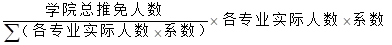 (十)学校下拨学院的推免名额减去各专业班级应推免人数向下取整得到的整数合计数后剩余的名额,按照各专业班级应推免人数小数点后一位从高到低再依次分配1名,分配完为止,即得各专业班级实际推免人数。各专业班级具体的推免名额见表1。