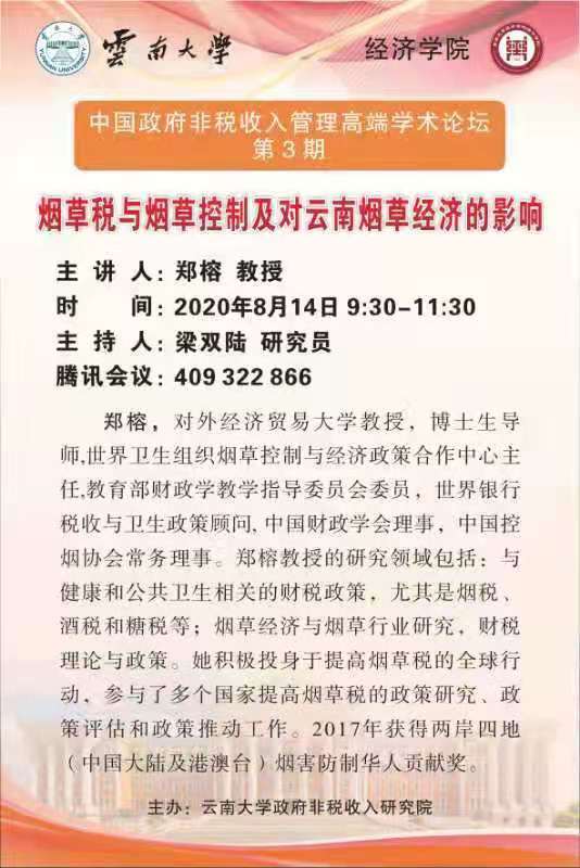 2020年8月14日,由伟德bv1946官网政府非税研究院主办,云南省财政厅非税收入管理处、票据管理中心协办的中国政府非税收入管理高端学术论坛第三期在线上举办。本次论坛邀请了对外经济贸易大学郑榕教授进行了题为“烟草税与烟草控制及对云南烟草经济的影响”的交流报告。公司党委书记梁双陆研究员担任主持,伟德bv1946官网众师生与云南省各地财政厅人员参与了本次讲座。