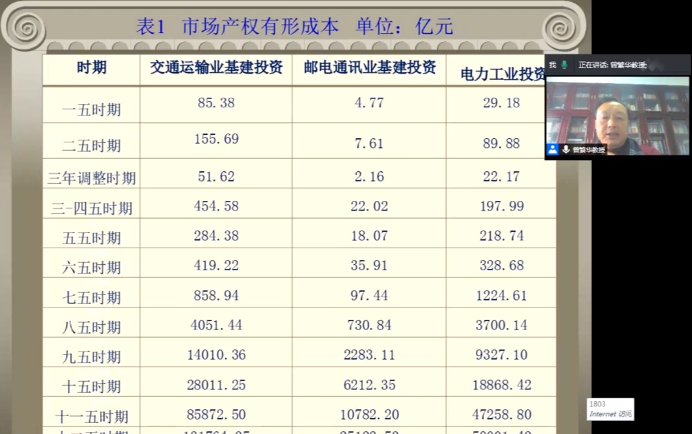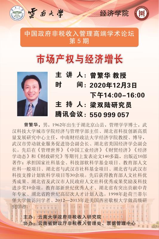 2020年12月3日,由伟德bv1946官网政府非税研究院主办,云南省财政厅非税收入管理处、票据管理中心协办的中国政府非税收入管理高端学术论坛第五期在线上举办。本次论坛邀请了武汉科技大学城市学院经济与管理学部主任、湖北省科技创新高质量发展研究中心主任,中南财经政法大学伟德bv1946官网教授曾繁华老师进行了题为“市场产权与经济增长”的交流报告,公司党委书记梁双陆研究员担任主持,伟德bv1946官网众师生与云南省各地财政厅人员共享“云端”资源,与曾繁华老师交流讨论,受益良多。