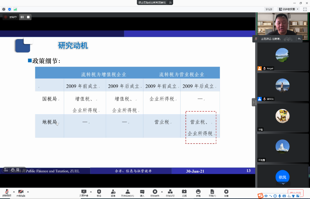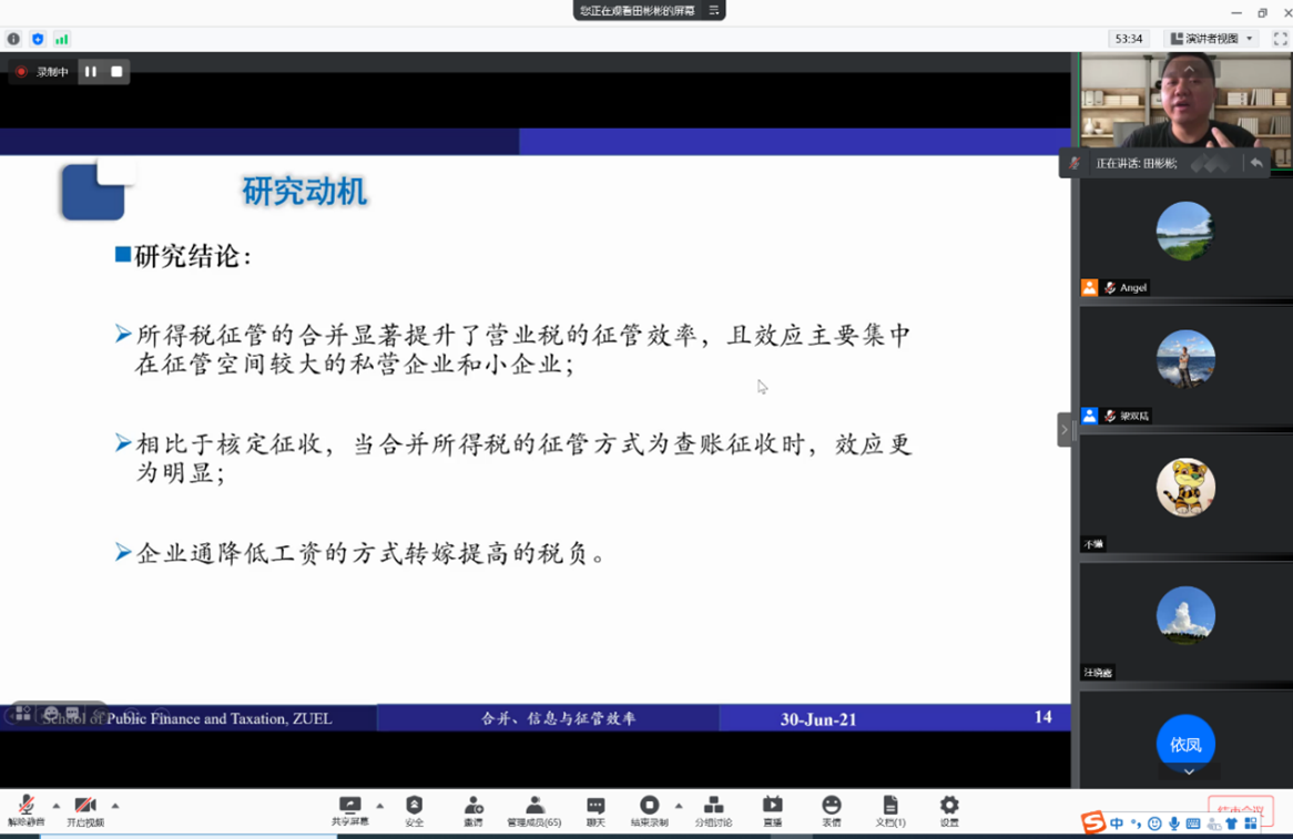 2021年6月30日,由伟德bv1946官网政府非税收入研究院主办,云南省财政厅非税收入管理处、票据管理中心协办的中国政府非税收入管理高端学术论坛第七期在腾讯会议线上举办。本次论坛邀请中南财经政法大学财政税务学院田彬彬教授进行了题为“合并、信息与征管效率”的交流报告,公司党委书记梁双陆研究员担任主持,伟德bv1946官网众师生与云南省各地财政局人员参与了本次讲座。