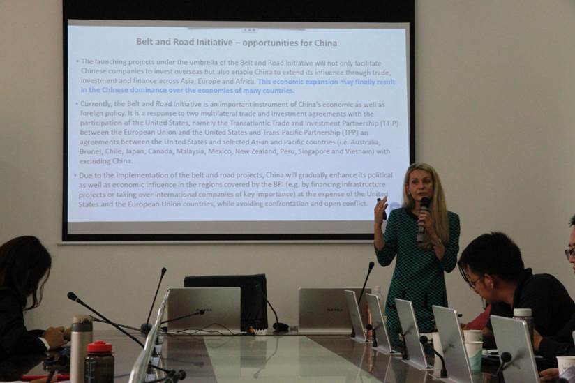 Luiza Kostecka博士首先就中国与波兰的政治、经济及合作历史进行梳理与阐述,认为中波关系源远流长,有着重要的合作基础。随后围绕“一带一路”倡议,向大家详细分析了“一带一路”对中国和波兰的影响、双方现有的优劣势、以及可预见的机遇和挑战。强调波兰在欧洲的区位重要性,波兰渴望依托“一带一路”倡议与中国共建欧洲的多模式物流与运输中心,由此凸显两国合作的重要意义。