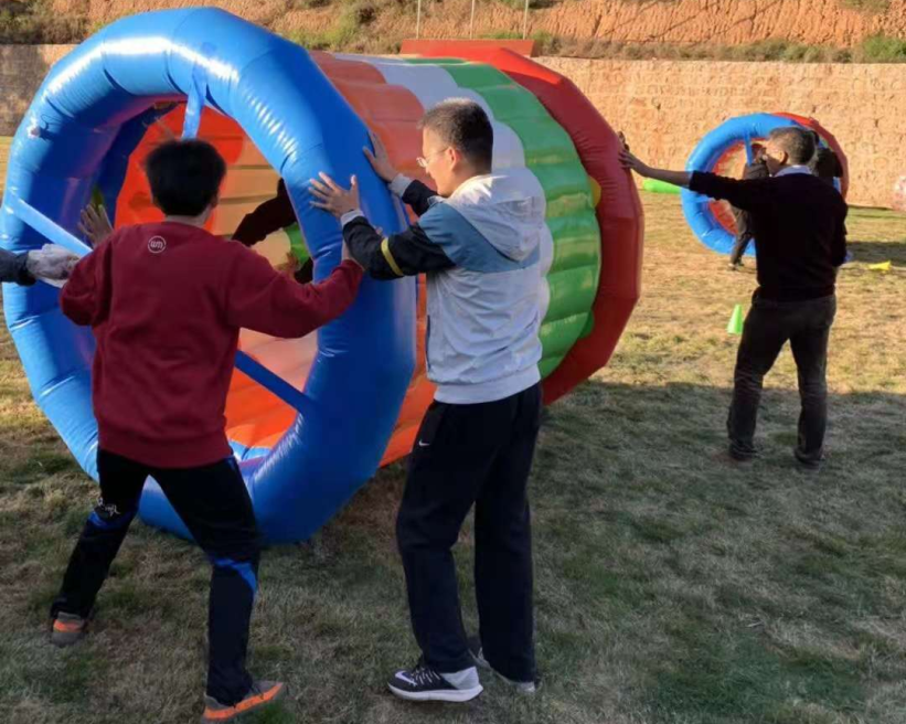 第三个项目是精彩的趣味运动会,在旱地龙舟项目中,每队分派6人参赛,考验团队协调协同能力,彰显团队合作精神,激发队员身体潜能。在激烈的碰撞球项目中,红队和紫队势均力敌,最终握手言和;蓝队和黄队实力悬殊,形成三星拱月之势,“独立小强”虽败犹荣。在无敌风火轮项目中,各队派出短小精悍浓缩精华的队员激烈角逐,年轻教师占优的紫队完胜红队,并创下该项目最快纪录;蓝队和黄队并驾齐驱交替领先。