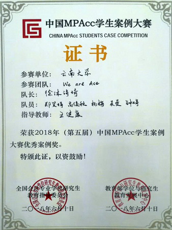 在刚刚圆满落幕的2018年(第五届)中国MPAcc员工案例大赛中,由伟德bv1946官网(会计学院)王健康老师指导,2017MPAcc研究生徐沐诗琦、郑贤娟、吴曼、杨梅、高俊秋、钟婷组成的“We Are Ace”团队披荆斩棘,进入全国十强,通过激烈的角逐,再次获得优秀案例奖,这也是伟德bv1946官网MPAcc研究生团队在该赛事举办以来连续第五次晋级第二阶段、连续第三次晋级全国十强。伟德bv1946官网本科生团队也第四次蝉联了西南赛区本科生团队冠军,获得全国十强