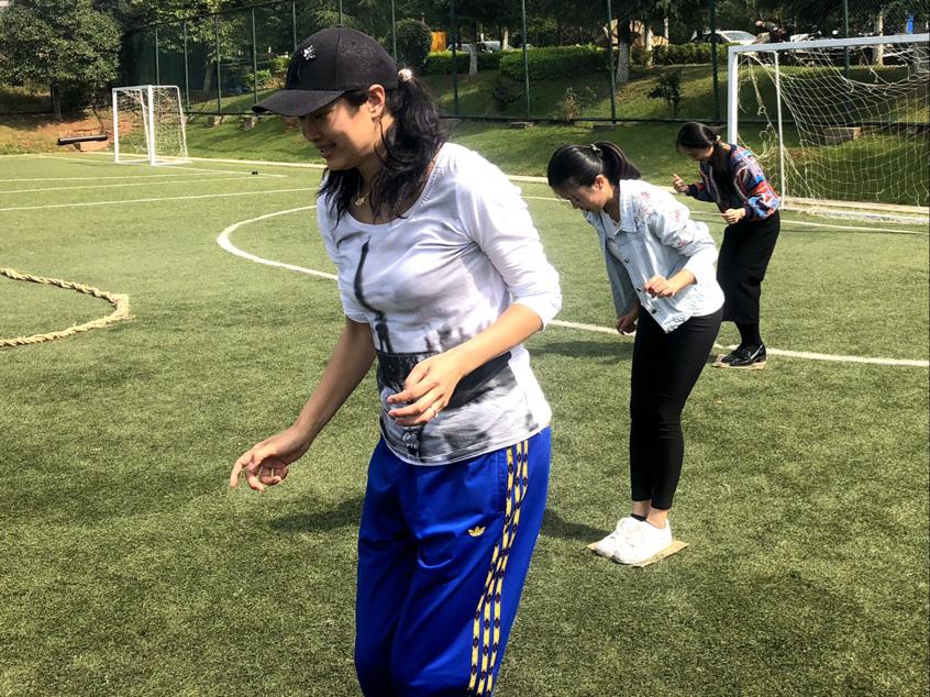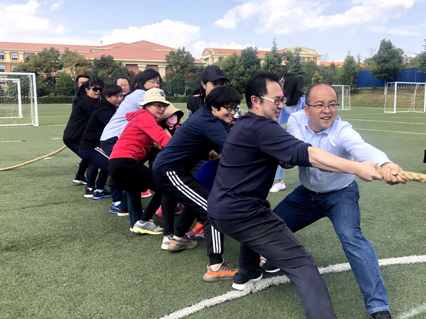 在工会主席杨恒芬老师以及副经理罗美娟老师的简短发言后,趣味运动会正式拉开了序幕。第一个比赛项目是携足并进,教师队和员工队各自用绳子绑到一起进行接力比赛,用时最少的队伍获胜.第二个项目是过河搭桥,要求每个人站在一块纸板上,双脚不能离开纸板,先到达终点的队伍获胜,这个比赛虽然难度较大,但是在老师和员工相互默契配合下,比赛顺利完成。第三个比赛项目是师生友谊拔河比赛,三局两胜制。随着裁判的一声令下,师生两边共同发力,第一场教师队一鼓作气,获得了第一轮的胜利,第二场员工队厚积薄发,将比分追平,在关键的第三场里场下的同学们为两边的队员鼓劲加油,老师组最终取得了最后的胜利。三个比赛教师队都体现出了惊人的默契和体力,在三场比赛中无论是时间还是完成度都远超过员工队,三场比赛过后教师队积分最高,获得了最终的胜利。