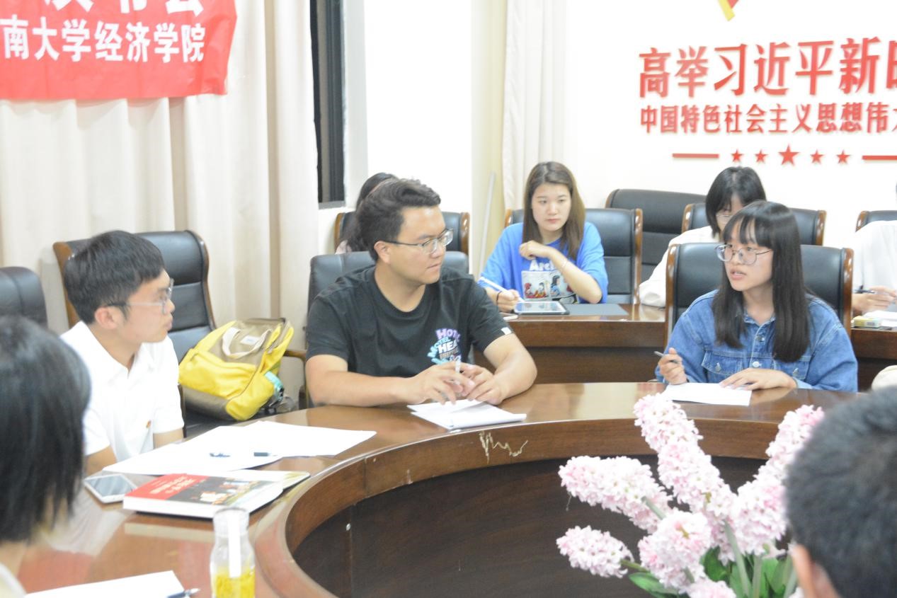 其次是解真题,把握青年成长的焦点。习总书记高度重视青年人成长成才的问题,《习近平与老员工朋友们》一书中字里行间都透露着总书记对青年成长和发展的关注,要求老员工们带着强烈的现实关怀和问题意识,联系实际,知行合一,积极主动地认识和改造世界。在实践中,我们要把握时代的脉搏,应对新环境中的困难和挑战;坚持需求导向,更好地联系和服务青年,面向基层,更好地解决青年人成才和创新创业的问题。赵熙学长在分享中还提出了一个问题,引起了同学们的热烈讨论。他问为什么我们要学习政治相关的理论知识呢?同学们踊跃发言,积极主动地发表了自己的看法,其中,来自国际商务的马薇同学讲到,现在我们青年人接受信息的渠道越来越多,信息种类繁多、良莠不齐,通过学习这些理论知识能帮助我们坚定自己的政治立场,树立坚持走中国特色社会主义道路的信心,让我们用这些理论知识来指导实践,成为一名合格的社会主义建设者。同学们纷纷表示赞同。