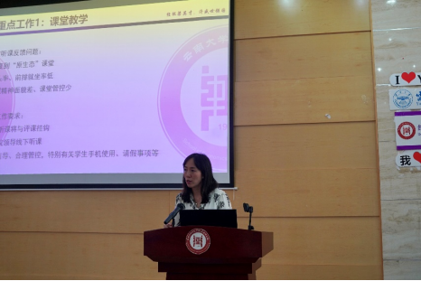 接下来,赵斌副教授代表督导组,就过去一周对43门课程的听课情况做出了具体说明。赵斌副教授一方面对本科课堂教学的督导过程中展现出的优点予以肯定,包括整体教学效果有所提高,课堂互动更加积极、教学流程把控程度提升;另一方面也对本轮听课中暴露出的问题予以指正,提倡使用层次分明、逻辑清晰的板书,进一步加强与员工的互动,鼓励教师之间相互听课、相互学习。
