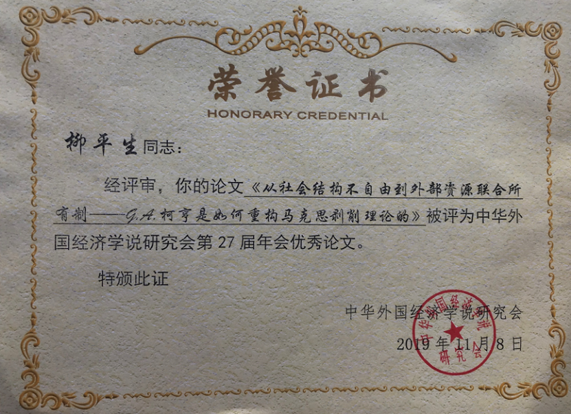 11月9-10日在安徽工业大学召开的中华外国经济学说研究会第27届年会上,公司柳平生副教授提交的论文《从社会结构不自由到外部资源联合所有制——G.A.柯亨是如何重构马克思剥削理论的》被评为本届年会优秀论文。