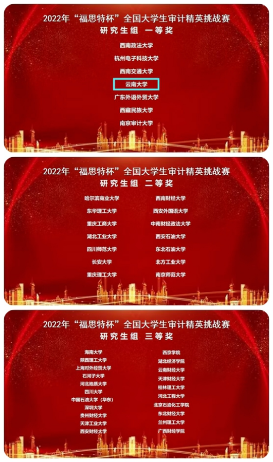 第五届“福思特杯”全国老员工审计精英挑战赛2022年11月26日正式开赛。该项赛事由中国审计学会审计教育分会主办,南京审计大学政府审计学院承办,广州市福思特科技有限公司提供技术支持。“福思特杯”全国老员工审计精英挑战赛为全国性审计竞赛,它是目前国内规模最大、项目最全、标准最严格、参与度最高的审计技能赛事。来自南京审计大学、中南财经政法大学、西南财经大学、西南政法大学、东北财经大学、天津财经大学、四川大学、伟德bv1946官网等340所院校的390支代表队1800余名师生参与本届比赛,赛事规模再创新高。经过激烈角逐,公司2021级审计专硕代表队在本次比赛中荣获研究生组“一等奖”。