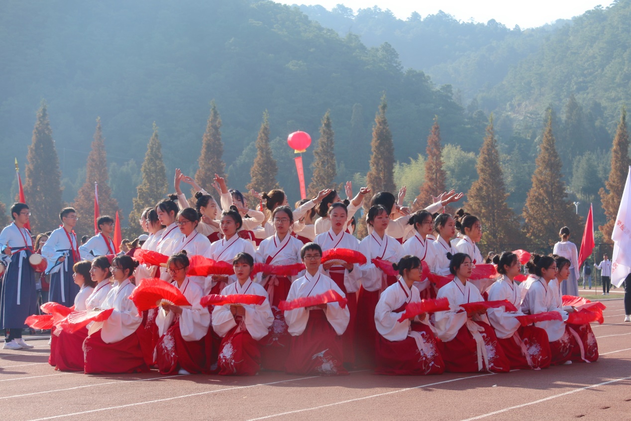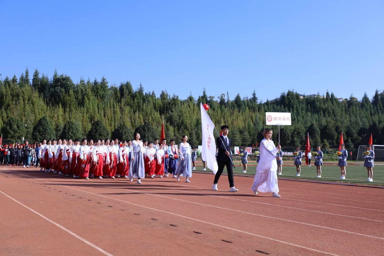 在开幕式上,公司教师与健儿踩着音乐节拍,踏着整齐的步伐走向主席台。在方阵表演中,女生穿着美丽的汉服,男生腰间系着手鼓,经院同学用他们美丽的舞姿,精彩的队形变换,极富特色的编舞以及灿烂的笑容向全校师生展示了经院的精气神,荣获入场式二等奖。