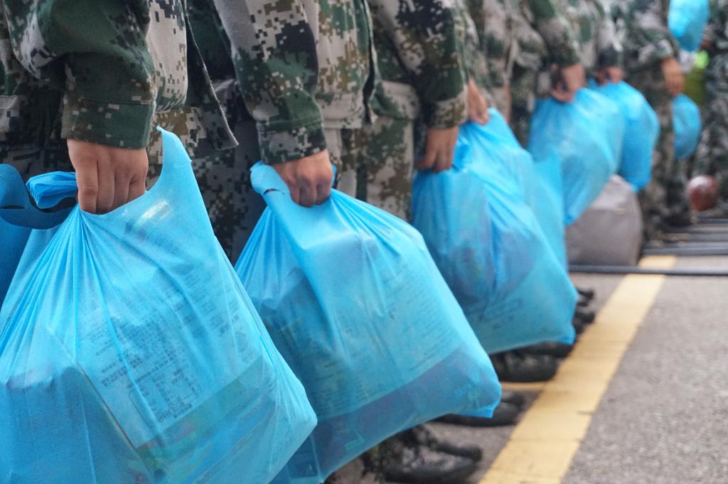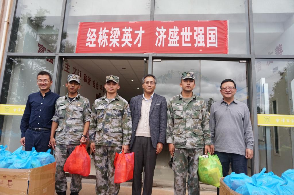 讲话结束后,梁双陆经理、张林副经理、武鹏副书记向同学们发放了精心准备的体育用品,希望同学们在开展紧张学习的同时不忘强健体魄,积极参与体育锻炼。随后,三位院领导将慰问品赠与教官,感谢他们在军训过程中的辛勤付出。在慰问教官之后,领导、老师们向全体2019级军训新生发放了品种多样、饱含着学院对同学们的关切与爱护的慰问品。