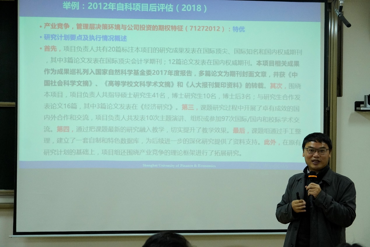在项目申请书的形成方面,靳教授指出要做好前期研究积累,仔细推敲和注重细节,学会凝练问题、分析文献、构思创新、探究理论支撑并密切联系中国实情;在项目结题环节中,靳教授给出了以下几个关键词,并对其进行了一一解释:贵在坚持、专家意见、学术规范、补短板、后评估;对于项目评审环节,靳教授给出了相关评价标准,并以此告诉在座老师如何使自己的申报文件更出彩。