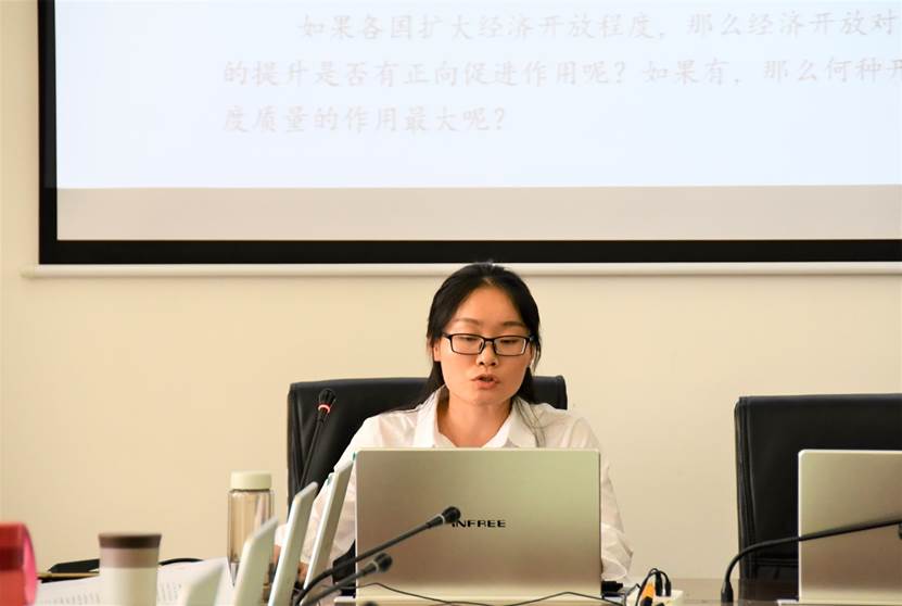 最后进行报告的是来自安徽财经大学的硕士研究生何芳同学,她利用1985—2016年138个国家及地区的面板数据进行了题为《经济开放对制度质量的异质性影响分析:一个跨国经验研究》的研究。其研究分析表明,单纯的贸易开放对经济发展程度不同的国家的制度质量存在不同影响,扩大向高收入经济体的出口对发展中国家的制度质量存在积极影响,同时,扩大从高收入经济体的进口对发达国家的制度质量也存在积极的正向影响。在点评环节,崔庆波副教授指出模型中分别从投资、贸易两个维度衡量经济开放,可以试图构建一个统一的开放指标来进行研究。