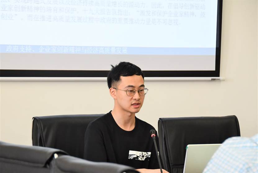第三场主题报告是由来自湖南大学的周郭思渝同学,他汇报的主题是:政府支持、企业家创新精神与经济高质量发展。周郭同学紧密围绕“企业家创新精神能否以及如何驱动高质量经济发展?”、“政府在这个过程中扮演着什么样的角色?”以及“如何才能更好地发挥政府支持的积极作用?”三个问题展开,此外,他还提出高质量发展所要求的社会效益部分需要政府的前瞻性引导的观点。最后针对周郭同学的现场报告,李波老师肯定了其整篇论文的逻辑,但是也指出了其在模型设计上存在的一些问题及改进方向。现场还有不少同学踊跃提出了自己的疑惑,与周郭同学进行了深入的交流。