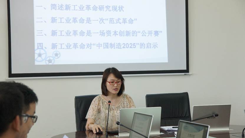随后由来自浙江大学的孙志艳同学带来第二场主题报告,报告主题为“新工业革命动力:技术集成与资本创新”。首先,孙志艳同学简要概述了新工业革命的研究现状并作出相应评价,同时对新工业革命的定义给出了自己的观点,她认为新工业革命是技术集成内驱与资本创新外驱的“双轮驱动”革命。她指出“中国制造2025”不等于“德国工业4.0”,她认为应该以理性“竞合观”应对新工业革命的机遇和挑战,并充分发挥资本创新的积极作用。针对孙同学的现场汇报,王守义副教授对论文进行了点评,并和在场的同学就“什么是资本?”和“资本创新与技术集成如何区分”等问题进行了深入探讨。