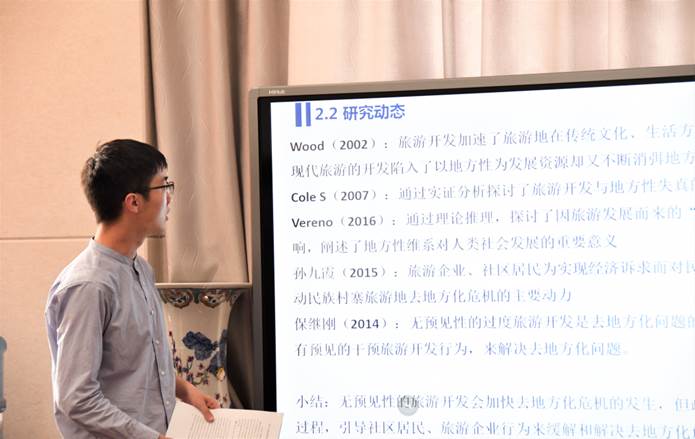 随后,伟德bv1946官网的汪熠杰同学带来了题为《去地方化危机下的民族村寨旅游开发对策研究——基于演化博弈分析》的论文汇报。他的论文基于演化博弈理论视角构建了复制动态模型,描述了民族村寨旅游利益主体间的博弈均衡状态,进而对民族村寨旅游开发中去地方化问题的解决进行了探讨。